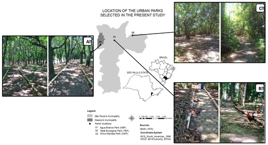 Map of the study area (São Paulo and Osaco City); ABP—Água Branca Park; TEP—Tietê Ecological Park; CMP—Chico Mendes Park.