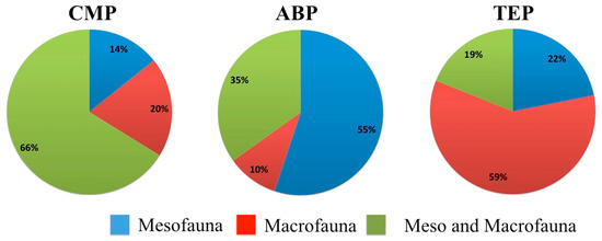 ABP had the highest proportion of mesofauna groups (55%), while TEP had the highest proportion of macrofauna groups and CMP showed the highest percentage of groups with individuals that can be classified as either macro or mesofauna (Figure 2).