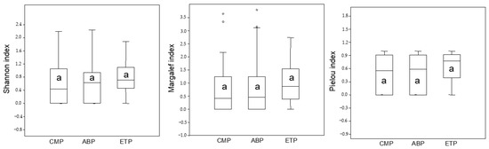 Box plots showing the median values of diversity indexes analyzed in the study areas. Asterisks indicate extreme values for some samples. Lowercase letters indicate statistical differences between groups (α < 5%).