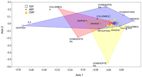 To demonstrate the biodiversity of arthropods associated with litterfall, a total of 1176 individuals were sampled, distributed into 19 orders, including 365 individuals belonging to 12 orders in CMP, 330 individuals in 16 orders in ABP and 481 individuals in 17 orders in TEP (Table 1). Three predominant orders were identified among the individuals sampled. The most abundant taxonomic group was Hymenoptera, representing 64% of the total sampled in CMP, 31% in ABP and 16% in TEP. The order Isopoda represented 50% of the individuals sampled in TEP, 12% in CMP and only 2% in ABP. Collembola represented 46% of the orders sampled in ABP; however, the order was less representative in CMP (6%) and TEP (5%). Other taxonomic groups with intermediate abundance were Araneae, Orthoptera, Acariformes and Coleoptera.