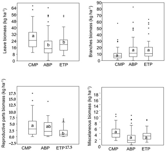 Box plots showing the median values of litterfall fractions biomass analyzed in the study areas. Asterisks indicate extreme values for some samples. Lowercase letters indicate statistical differences between groups (α < 5%).