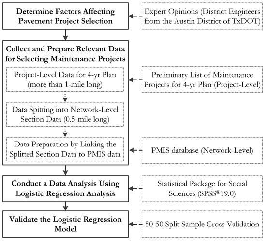 The main goal of this study is to prioritize network-level project sections to support the Four-Year Pavement Management Plan. To effectively achieve this goal, logistic regression analysis was conducted using inventory data recorded from the PMIS and a list of projects for Austin district included in the statewide Four-Year Pavement Management Plan. Using the logit model, a large number of project sections that consistently matched with actual projects were selected and prioritized for sustainable pavement management. Figure 2 shows an overview of the model-development process.
