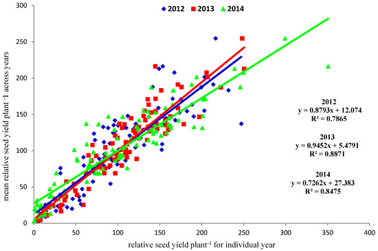 Linear regression and equations of relative seed yield plant−1 and mean relative seed yield plant−1 for 2012, 2013 and 2014.