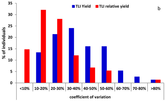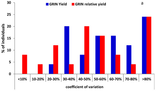 Distribution of coefficient of variation values for Yield and relative seed yield for; (a) USDA-Germplasm Resources Information Network (GRIN) and (b) The Land Institute (TLI) materials.
