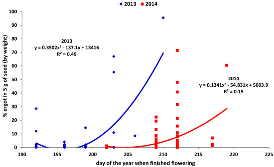 Percent ergot (by weight) in five grams of seed was related to day of the year when the plants finished flowering. The relationship was best defined by a quadratic curve (highest R2), with early and late finishing plants having in general more ergot (Figure 3). Finishing flowering later showed the highest ergot levels.