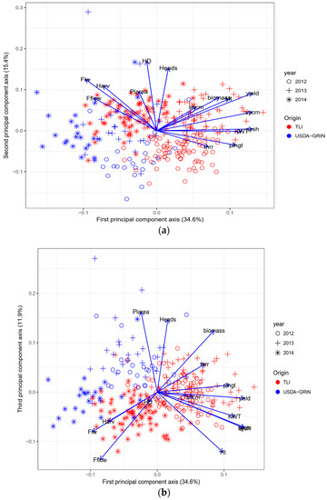 Principal component analysis indicated that there was a shift in the population from the GRIN accessions which were not selected for seed production versus the TLI selected materials (Figure 4a,b). In general, for the first and second principal components, GRIN accessions were on the negative axis of the figure and TLI were on the positive axis of the plot (Figure 4a). Years progressed from the negative axis through to the positive axis (Figure 4a). Variation was seen in each population with some overlap, both with some GRIN accessions showing TLI-like results and some TLI accessions showing GRIN-like results. For the plot of the first principal component versus the third, in general, TLI occupied the lower right part of the plot with GRIN in the upper left (Figure 4b). Years were relatively distinct, with 2012 in the lower left quadrant, 2013 in the upper right and 2014 in the lower right (Figure 4b).