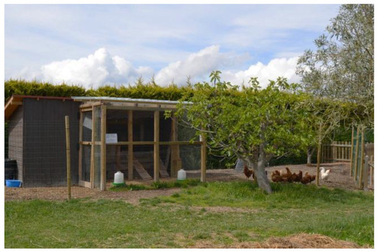 Figure 1). The chickens enter the courtyards independently from the coop, which allows their access to be restricted to one run or another. The indoor part comprises a coop that is 18 m