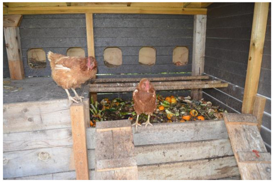 Figure 2). Above the first composter are perches (4 × 130 cm) positioned so that the hen droppings fall inside the composter. The second and third composters have closed wooden lids to prevent the hens from accessing the material.