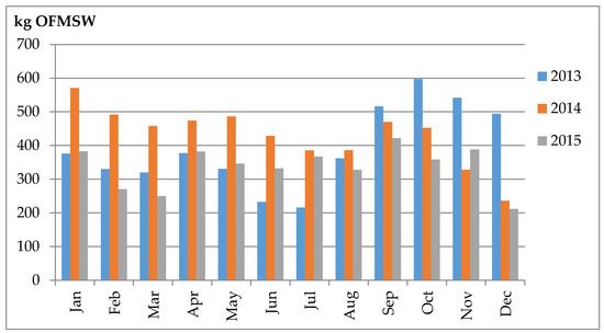 Table 1) with a significant difference recorded between years and months. In addition, the contribution of waste by participants was not uniform with varying quantities provided by the different families. In 2013, the amount of waste managed was lower than the average among the three years possibly because it was the year of implementation. The initial adjustment period was limited to the few first months and the contributions of the second half of 2013 were comparable to those of the other two years. In 2015, which was the third year of the project, the amount of composted waste was the lowest in three years. This may be due to a drop in participant enthusiasm from the initial levels, which decreased the assiduity of waste intake by the CH. Due to the high degree of involvement of the participants, the potential diversion of OFMSW from the official urban waste management system in the area is very important since this result does not include restaurants, refectories, or cafeterias.