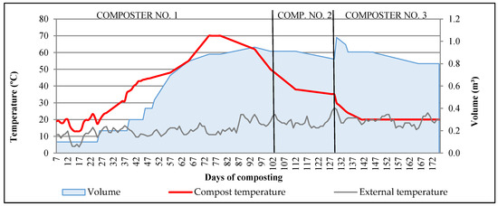 25]. Variations in compost volume were estimated by measuring the height of the compost inside the bin. Weight losses were calculated as the percentage of the final compost weight over the cumulative sum of each addition of waste [