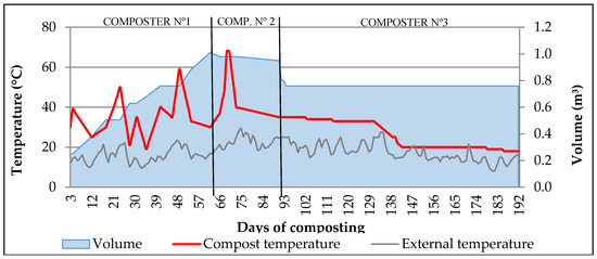 The increases in temperature recorded throughout the composting process indicated a significant intensity of aerobic decomposition and, therefore, a greater weight and volume reduction. As had been described in other studies [