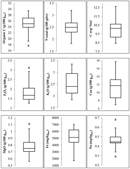 The parametric data sub-sets obtained from each final determination of the 16 compost batches were statistically evaluated through a visual summary using the box and whisker plot approach [