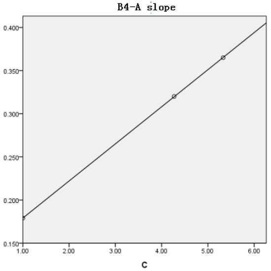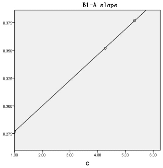 Table 11 shows the results of moderating analysis between technical–strategic element synergy and collaborative innovation performance. According to Table 11, we can see that the three equations of ΔR2 and the coefficients of B4*C are significant, which indicates that the regulation effect exists. It can be seen from Figure 4 that the greater the C is, the greater the effect of B4 on A is, which supports H7.4—the talent flow has a positive regulation effect on the correlation between technical–strategic element synergy and collaborative innovation performance.