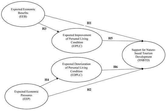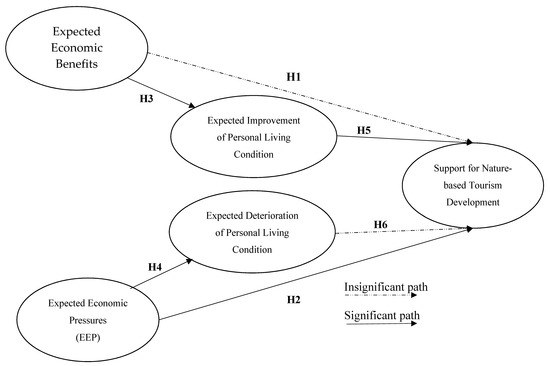 A number of studies have reported a positive relationship between economic benefits and support for tourism [27]. Employment opportunities, tourism revenues and infrastructure improvement are some of the common motivations for local communities to endorse tourism development [28,29,30]. Various scholars have reported that a community’s economic status and dependency on the tourism industry affect residents’ attitudes and responses to tourism development [31,32,33]; other studies have found a strong connection between personal economic benefits from and support for tourism [18,26,34]. Personal benefits from tourism were found to direct residents’ support for tourism development, particularly during times of economic uncertainty, such as during the economic crisis in Greece [24]. However, some residents believe that tourism development can bring unwanted economic pressure. For example, residents in certain destinations were aware of inflation in goods and services as a result of tourism development [35,36]. Rising land and housing prices were common if the destination became a popular tourist site [36]. In our study areas, local residents of the Wolong National Nature Reserve have been suffering from a significant drop of income due to the earthquake and they are longing for great improvement of their financial situation through development of nature-based tourism. The following hypotheses are therefore developed regarding whether residents’ expected economic impacts would influence their support for the nature-based tourism development.