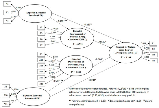 Observed relationships between local residents’ expected attitudes and support for the post-earthquake nature-based tourism development in the Wolong National Nature Reserve.