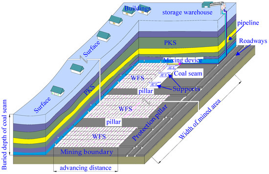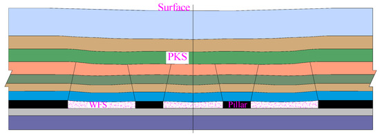 When the mined area of WSBM is increased to infinity, the total load on WFSs and coal pillars approximates the weight of the overlying strata. In practice, the stope is a limited area. According to the key stratum theory, the stratum that controls the movement of the whole overburden strata is defined as the primary key strata (PKS), playing a controlling role in the deformation and breakage of the strata [23]. Thus, the overburden control imposed by the PKS can substantially reduce the load on WFSs and pillars.
