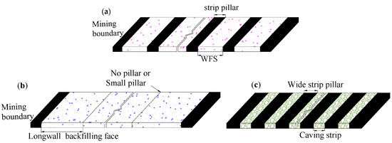 The WSBM (Figure 2a) combining backfill mining and strip mining (Figure 2c) is a comprehensive method of subsidence control. It is applicable to large-scale (critical) coal extraction under BRW and high demand for surface subsidence control. As compared to longwall backfill mining (LBM), the WSBM method has larger pillars and smaller filling strips, of which the width of the filling strip exceeding that of the strip pillar by one to three times, so the filling strip is called wide filling strip (WFS). When the LBM method is adopted, more than one longwall backfilling face is needed at the critical extraction stage, while only small pillars are left between adjacent faces, or none at all (Figure 2b). Despite the slight decline in the recovery rate, the WSBM brings out less disturbance to the overburden, thus making a more efficient surface subsidence control possible. Moreover, the design of appropriate WFSW will facilitate the coordination between mining and filling operations and thereby improve the production efficiency.