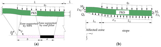 A simplified beam model was constructed for the PKS (Figure 4a). Given the bilateral symmetry of the model, only one half of the PKS in the disturbed zone is analyzed (Figure 4b). As in [23], weak strata overlying the PKS are replaced by the equivalent load q0. During the WSBM process, the strata beneath the PKS are compacted and can be treated as an elastic foundation/bed of the Winkler type. According to the Winkler hypothesis, the subsidence at an arbitrary point of the elastic bed surface is directly proportional to the pressure at this point. The stress arising from the interaction between the PKS and underlying strata can be calculated by the following formula [24]: