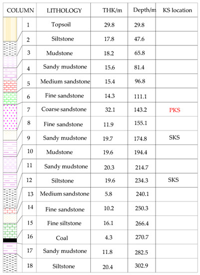 The surface subsidence control of WSBM requires the availability of at least one thick and hard rock layer in the overburden. The PKS identification was provided by using the original software package called KSPB which was developed in Xuzhou, China [28]. The limit span of the PKS can be calculated using a clamped-clamped beam model, and WFSW can be determined via the distance from the PKS to the coal seam and the inclination of fracture surface in the strata: