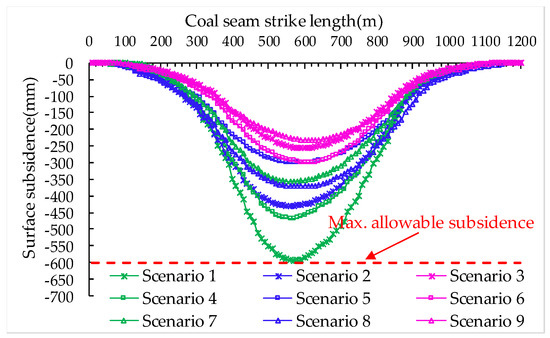 Distribution of surface subsidence along the seam strike for nine scenarios.