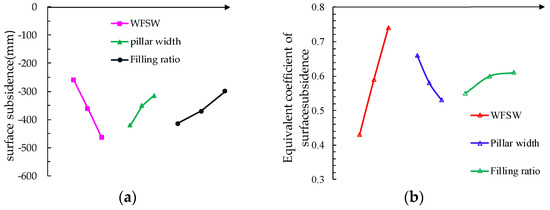 - As shown in Figure 9a, the WFSW has a positive correlation with the surface subsidence, while the pillar width and filling ratio are negatively correlated with the surface subsidence. Based on the obtained range of the three factors influencing the surface subsidence (Table 4) in WSBM, they can be ranked in descending order of their effect as follows: the WFSW, filling ratio, and pillar width. With the WFSW decreasing from 96 m to 72 m, the maximum surface subsidence was reduced by 210.8 mm, or by 44.5%. Therefore, in order to meet the requirements of the surface control and improve its reliability, the reduction of WSFM can be given priority.