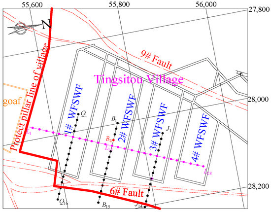 Taoyi coal mine is located in the Handan mining area, Hebei Province, China. There is a high density of villages on the surface of the mine, and local coal resources are all buried under villages. The #2 coal seam was mined, whose dip is 8°, and has an average mining height of 4.3 m. The experimental stope is located between #6 and #9 faults under the Tingsitou village and is protected by barrier pillars from both sides. Its specific location is shown in Figure 10.