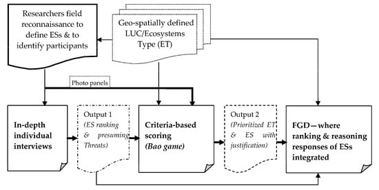 The research generally followed three stages including data generation and synthesis methods (Figure 2). These were (1) on-site individual in-depth interviews, from which farmers’ perception about the most important ESs provided by different LUC types and perceived threats were presented. These interviews were typically conducted for 1 to 2 h with each interviewee in all kebeles. The interview focused on the general household characteristics of the farmers and on the farmers’ perceptions about the most important ESs provided by the predominant agro-ecosystems. Besides, the interview focused on assessing attributes (mainly “threats” to ESs) of the 16 ecosystem services; (2) Bao game (a traditional game often known and played in rural areas of eastern Africa) [49] was used for criteria-based scoring. It is an approach used to elicit farmers’ ratings and reasoning of ESs provided by LUC types; (3) focus group discussions; in which selected participants meet to consolidate and clarify the reason behind bao rating values as well as discuss on the most important ES types, their threats, and the type of land use necessary to provide the selected service. A photo panel (Figure 3) visually outlining the concept of LUC types and ecosystem services was then presented to participants during all the stages to assist the discussion. As there have been heroic claims regarding the proper implementation and usage of participatory approaches to support decision-making in rural development activities, the way we followed in this study can further improve the legitimacy of our result. Nearly all of the intangible values of a land uses, mainly of agro-ecosystems, were obtained from farmers’ experience. In other words, this cannot be easily known by other methods like laboratory measurements or experimentations. Participatory methods, therefore, have a vital significance for successful ESs value assessment of land uses because they employ the intangible value of farmer’s knowledge. Several studies in the literature highlighted that the community is the one that knows more about the benefits they get or expect from a land use they want to implement [18,50]. Moreover, the participation of the farmers is compulsory as the values of various land uses are influenced by local socioeconomic and environmental conditions.