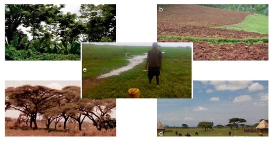 Pictorial representations of the major ecosystem (LUC) types used as photo panel resources during the three stages of the data collection process in the Gedeo-Abaya landscape: (a) agroforestry; (b) cultivation land; (c) woodland; (d) grazing land; (e) wetland (Note: All photos were taken by the first author except for (a,e)—Reproduced with permission from Temesgen et al. [11]).