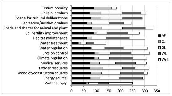 Aggregate relative importance (%) of the bundle services values offered by five ecosystem/LUC types (AF—agroforestry, CL—cultivation land, GL—grazing land, WL—woodland and WeL—wetland) as per the perceptions of attendant local farmers.