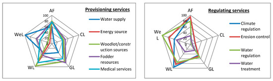 Relative importance (%) of the ecosystem services offered by five ecosystem (LUC) types (AF—agroforestry, CL—cultivation land, GL—grazing land, WL—woodland and, WeL—wetland) according to the priorities and interests of local farmers.