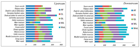 With regard to individual ecosystem services, Shade and shelter for animal and plant was ranked first in the upstream, while fodder sources was first in the downstream region, with aggregate relative importance of 70.3% and 70.1%, respectively. Erosion control was the second most highly valued service type in the both up- (61.9%) and downstream (67.6%) regions. Woodlot/construction source, water regulation, habitat maintenance, and energy sources (mainly fuelwood for domestic and marketing) displayed a similar proportion of substantial values in the upstream region (Figure 8). Similarly, climate regulation, water regulation, shade and shelter for animal and plants, habitat maintenance, religious value, and woodlots/construction sources showed a similar proportion of significant values in the downstream region. Conversely, water treatment and tenure security were the least valued service types in both regions.