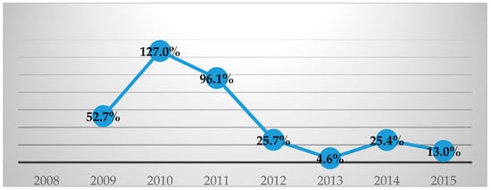 According to the Annuaire Statistique of Changping, the sewage information from 2009 to 2015 are shown as Table 1 and Figure 2, Figure 3 and Figure 4. From the table and pictures, the sewage quantity and the total amount of centralized sewage (part of the whole sewage that disposed by factories) of Changping city have been increasing annually, as has the link relative ratio of centralized sewage. Because the government pays high attention to environmental pollution and has put strict limitations on sewage discharge and disposal, the increasing trend of relative ratio of centralized sewage in 2009, 2010, and 2011 were relatively high, and then relatively gentler in the later years, but still with growing speed.
