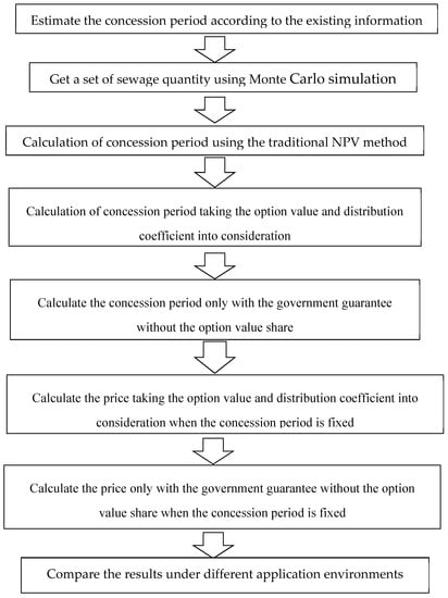 From the model built above, important factors of the project’s concession period include NPV, option value, the distribution coefficient between government and private investors, the concession period, and the price. The calculating process is shown in Figure 5.