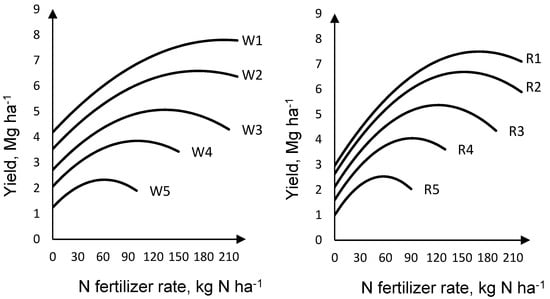 where Y is yield (Mg ha−1), N is N fertilization rate (kg N ha−1), a is the quadratic coefficient, b is the linear coefficient and c is a constant.