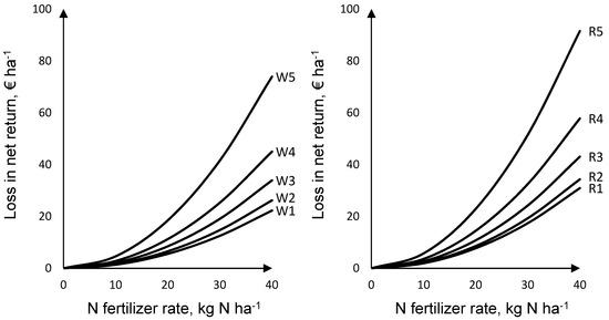In our calculation for net return, we performed a partial budgeting. N fertilizer was the only production factor that was adjusted affecting yield. Net return over N fertilizer applied (€ ha−1) was calculated as the difference between revenue of crop sales and cost of N fertilizer applied (Equation (17)). Table 4 presents the prices of N fertilizers and crops considered in this study.