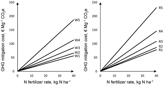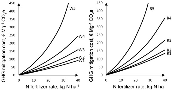 N fertilizer reduction has been considered from GHG mitigation point of view at different scales. For instance, Domínguez et al. [24] evaluated the EU-wide implications of a reduction in N fertilizer input—while maintaining output constant—via eliminating assumed over-fertilization and/or achieving more balanced N fertilizer management between mineral and organic N fertilization. Mérel et al. [25] assessed the effects of an N fertilizer tax on N mitigation at the intensive (input intensity adjustments) and extensive margins (acreage reallocation) at the regional scale. While there is information at aggregated levels in terms of to what extent and at what costs N fertilizer reduction offers GHG mitigation potentials, there is little information on cost-efficient GHG mitigation at different sites considering different yield responses to stepwise reduction of N fertilization. Such indication of GHG mitigation costs could enable comparability of GHG mitigation potentials by N fertilizer reduction among sites, since site-dependent climate and soil characteristics result in differences in crop yield potentials which in turn may lead to different GHG mitigation costs. This was already shown for GHG mitigation potentials and costs of biogas production in Brandenburg, if different feedstock are grown at sites with different yield potentials [26].