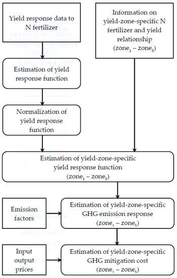 We constructed a model which reflects yield and economic response to N fertilizer reduction in yield-zones with different yield potentials in order to identify comparative advantages for GHG mitigation. A normalization approach following Krayl [29] was employed to transfer yield response to N fertilizer from sites with known input-output relations to yield-zones lacking that information. The workflow of the methodological approach is shown in Scheme 1.