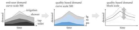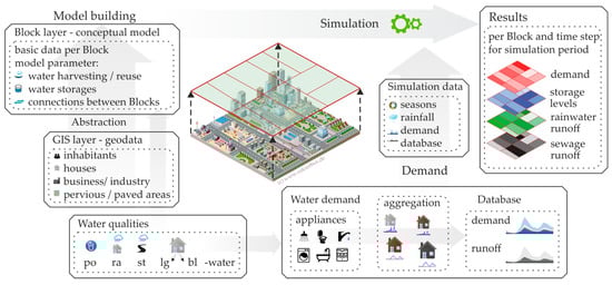 Scheme of the model development: abstraction of detailed data to a conceptual model (assignment of water qualities—potable (po), rain (ra), storm (st), light grey (lg), and black (bl)—water—end-user water demand to Block demand curves, areal data to Block parameters and implementation of decentralised measures), simulation (with statistical data) and spatially presentation of the results.