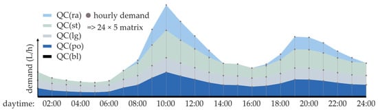 Schematic example for a quality-based daily demand curve (DC) containing five Quality Classes (QC; QC(bl) = 0) over 24 h.