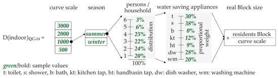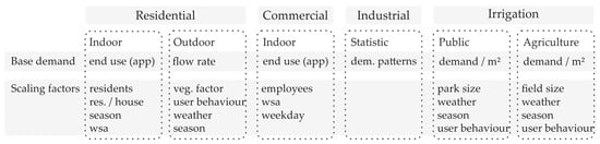 Demand types (residential, commercial, industrial, and irrigation). The base demand originates from statistical data; scaling factors are Block-dependent parameters to assemble the individual Block demand.