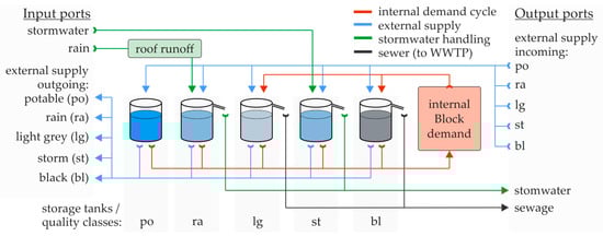 Scheme of a WBM-Block; storage facilities for every QC as core of the Block, demand inside the Block, internal flow pathways and connections to the model environment.