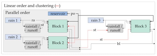 Block connections in linear and parallel order, rain 1 to 3 is the regional precipitation for each Block, Block 1 and 2 are connected to the reservoir without connection to each other (parallel order), Block 3 serves as stormwater cluster; the input and output ports are ordered like shown in