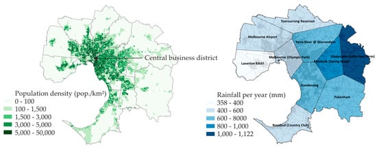 Melbourne: population density (left); and rain distribution in mm/year (right).