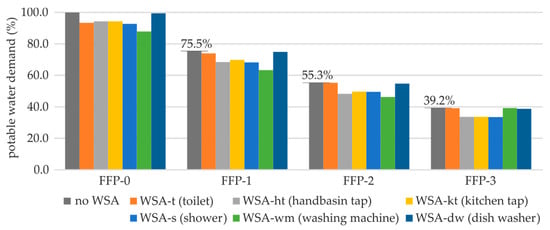Combination of the water saving appliances scenarios (WSA scenarios) and the FFP-policies. Annual potable water demand compared to the initial model without water saving appliances and with ffp-0 qualities. Each column represents the potable water demand of one WSA/FFP combination.