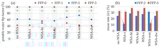 Results from the WSA-scenarios: (a) the potable water ffp-factor (part of the demand that must be potable according to the definition); and (b) the greywater reuse rate (rr) (%).