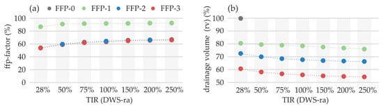 Results from the DWS-ra scenarios (combined with FFP-1 to FFP-3): (a) ffp-factor (defined rainwater demand covered by ra); and (b) annual drainage volume (rv) (FFP-0 as reference runoff).