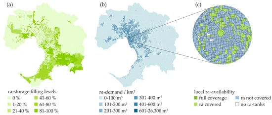 Local difference in rainwater availability. Results from the DWS-ra (TIR 250%, FFP-3) for one summer day (15 December 2015): (a) fl for ra-storages (average of the day); (b) ra-demand in m3/km² (the highest demand value is caused by very small Block sizes); and (c) local disparity between Blocks where ra demand was met and where a QC-upgrade is necessary.