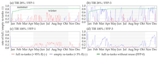 Ratio of full and empty ra-tanks at each time step (DWS-ra): (a) TIR 28%, FFP-1; (b) TIR 28%, FFP-3; (c) TIR 100%, FFP-1; (d) TIR 100%, FFP-3; compared to the FFP-0 scenario (green line).