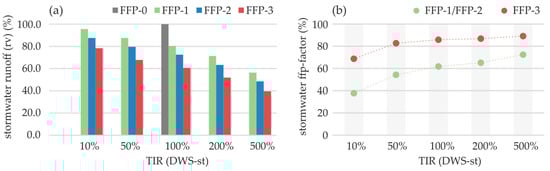Results for the DWS-st scenarios: (a) annual stormwater runoff volume (rv) compared to the FFP-0 without stormwater reuse; and (b) stormwater ffp-factor.