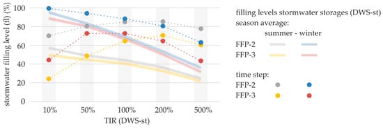 Results for the DWS-st scenarios: filling levels (fl) of all storages for seasonal average and one time step (summer, 15 December 2015; winter, 1 July 2015; no rainfall for at least three days before measurement).